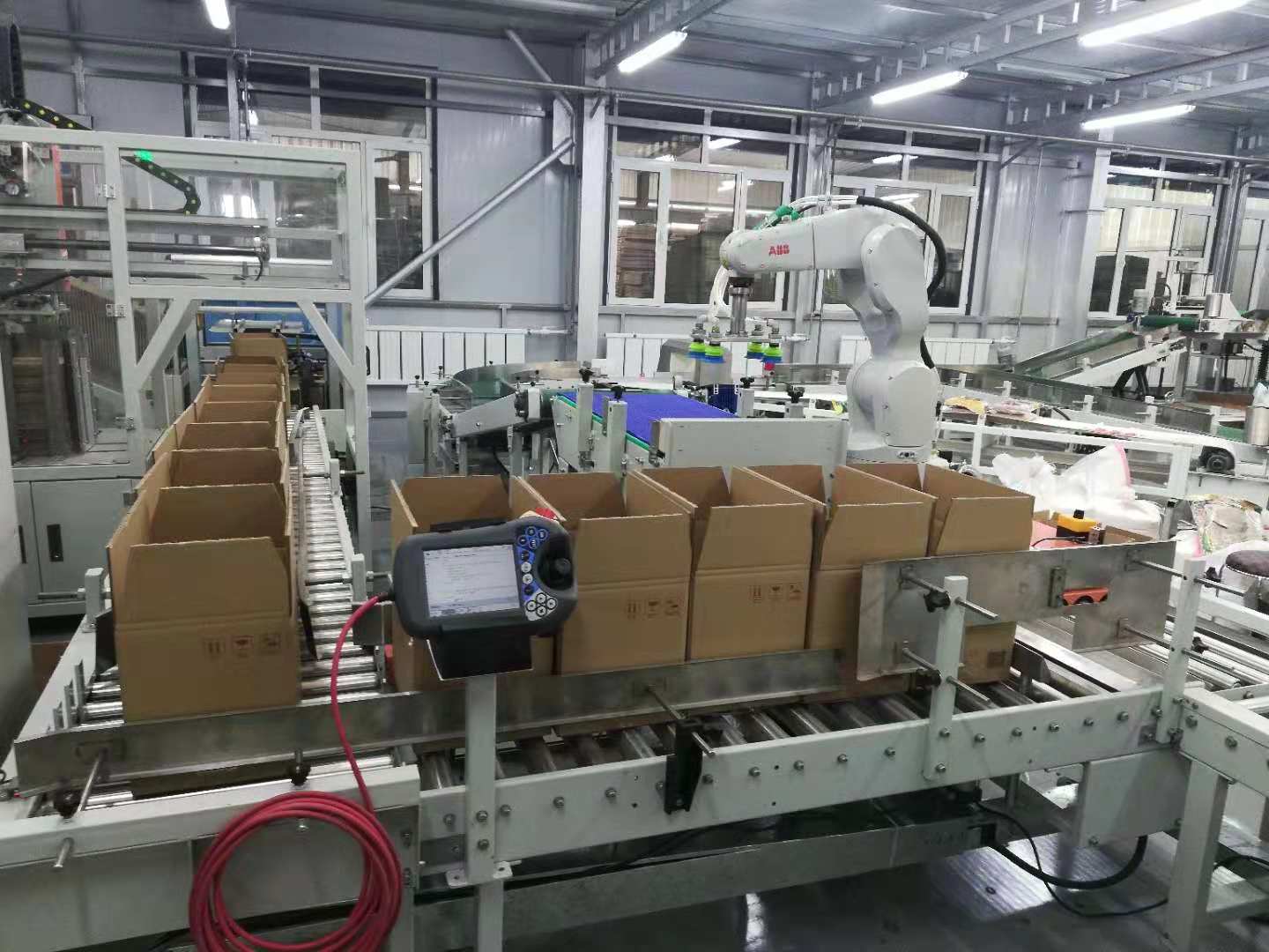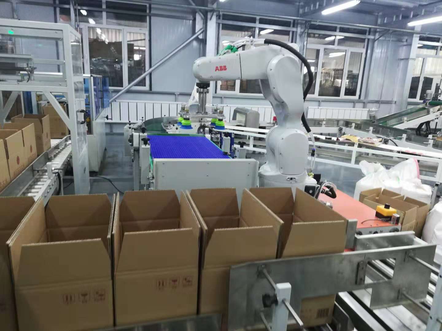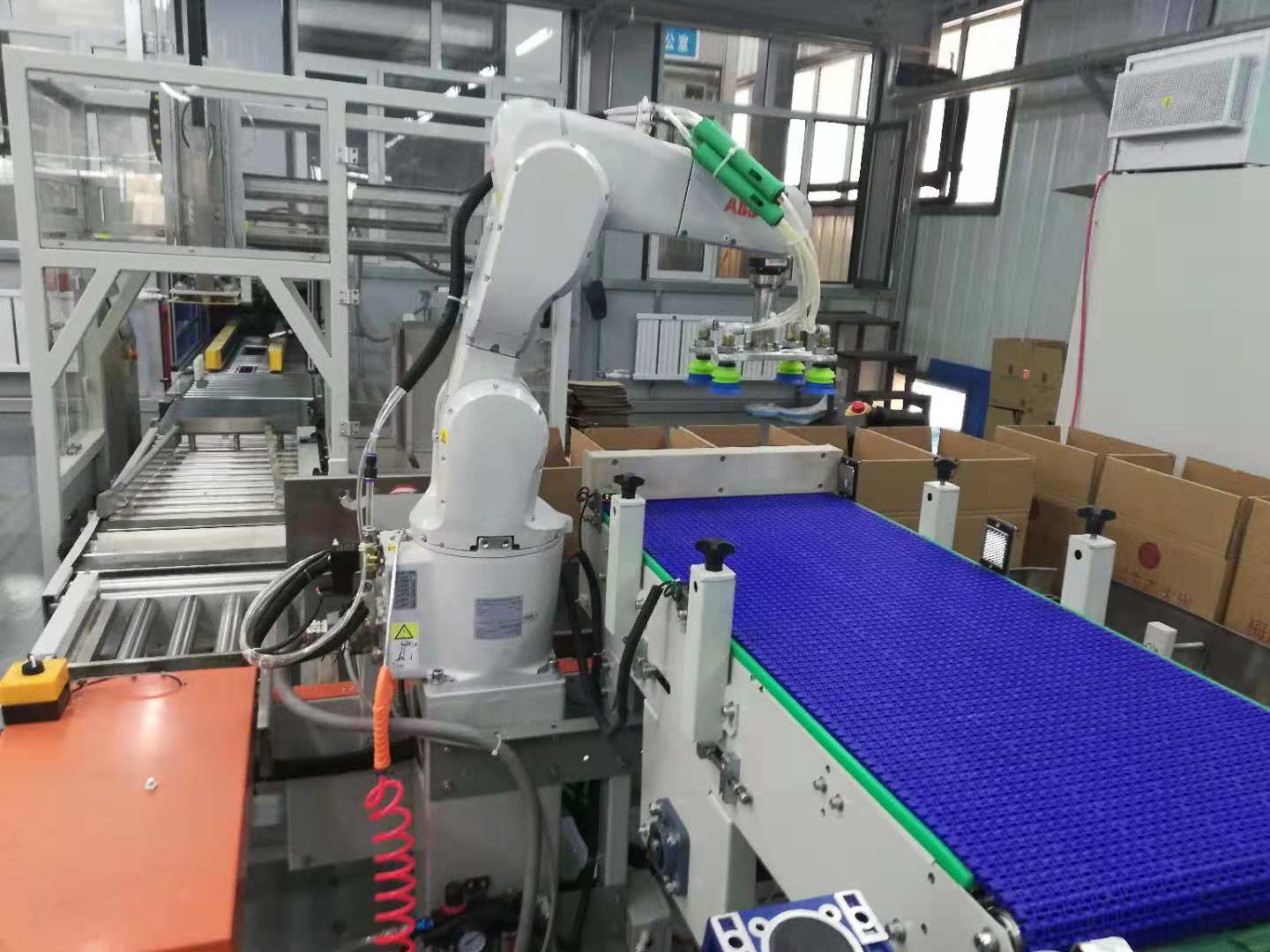 將產品通過進料輸送帶輸送進料,機器人及夾具到產品上方,抓取產品后移動到裝箱位,按事先輸入的裝箱形式進行產品裝箱。